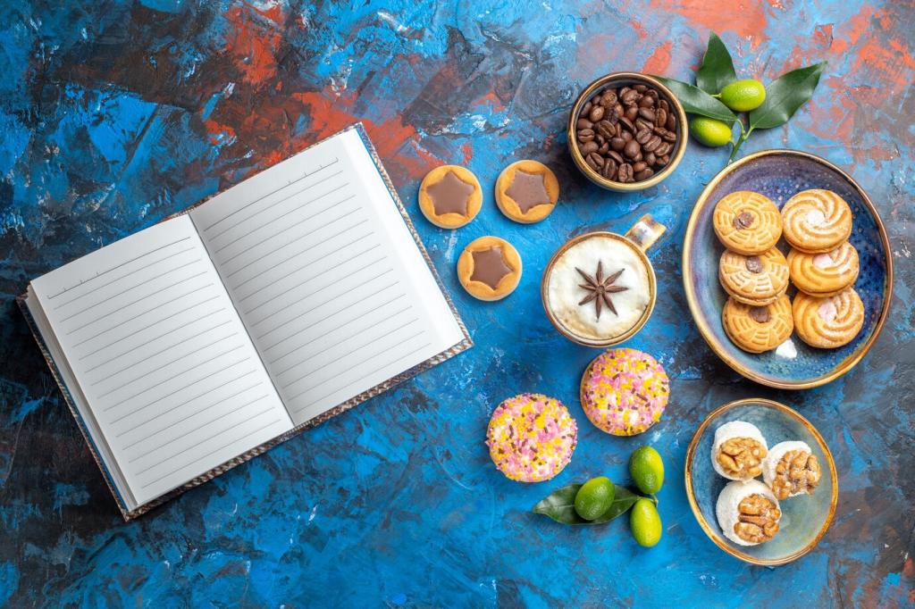 Nutze vergilbte Buchseiten, eine alte Brille, ein Tintenfass oder Kartenfragmente als Bühne. Achte darauf, dass Requisiten die Geschichte verstärken, nicht das Essen übertönen. Poste deine Setups, damit wir über Proportion, Blickführung und stille Hinweise fachsimpeln und voneinander lernen.